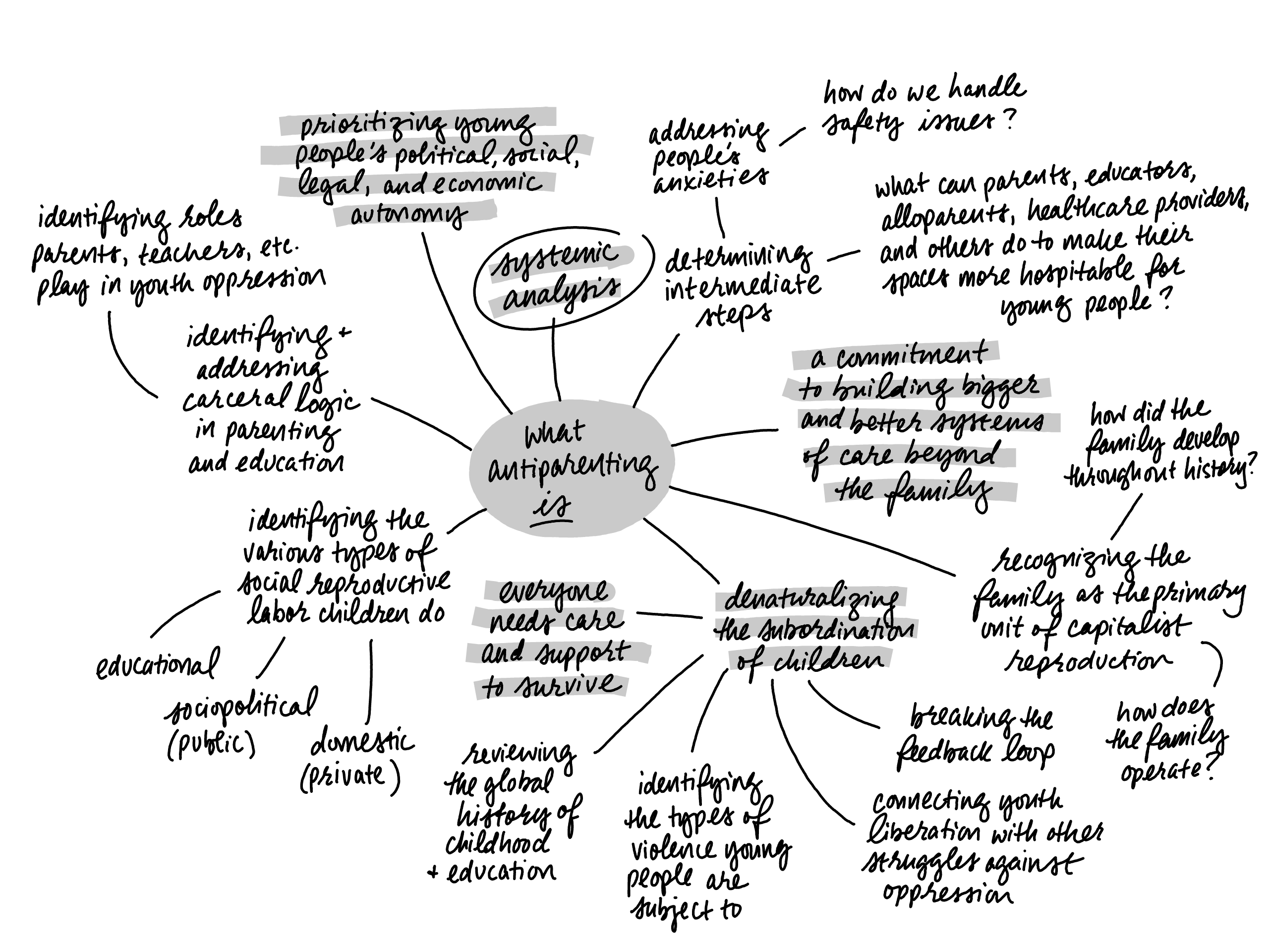 I break down concepts best through mind maps, so I made one to represent what "antiparenting" means to me: